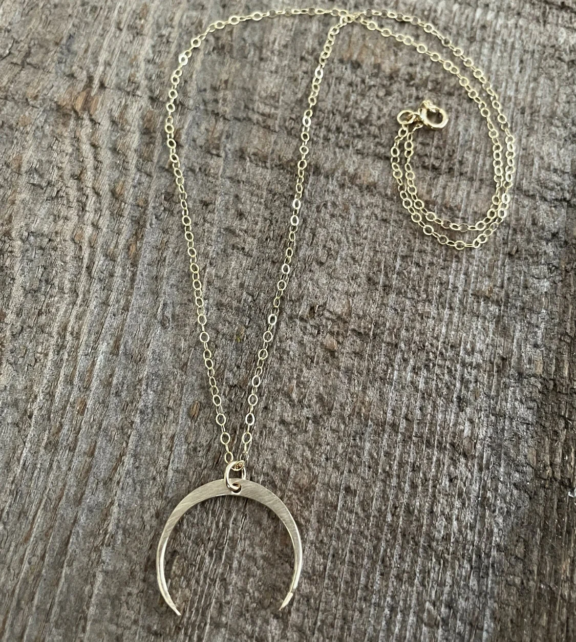 Shop › 16" Crescent Moon Necklace Image 1 of 1 16" Crescent Moon Necklace $68.00 14k gold fill, flat hammer finish.16" chain Purchase Added! 14k gold fill, flat hammer finish.16" chain