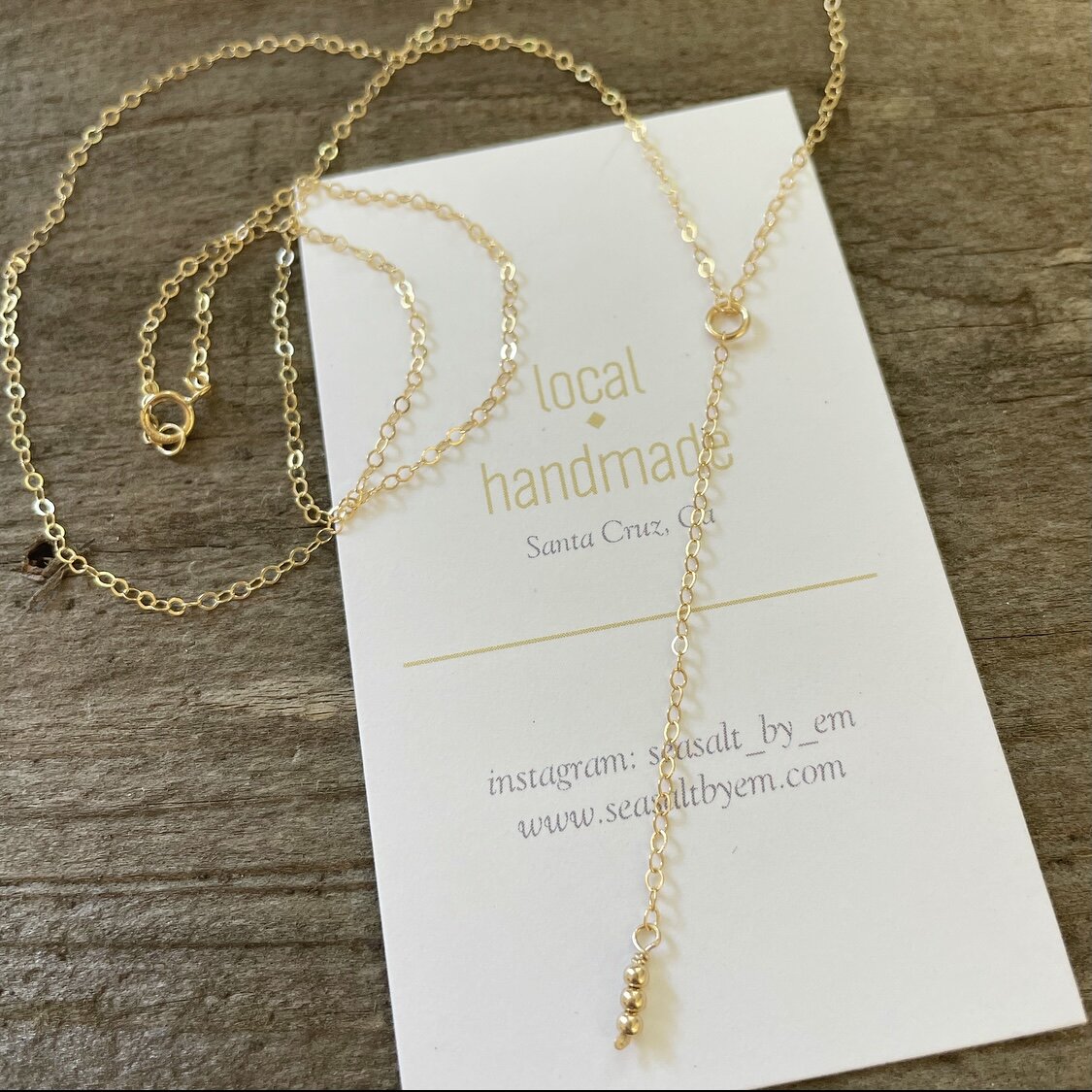 Shop › Goldie Drop Necklace Image 1 of 1 Goldie Drop Necklace $60.00 14k gold filled 20” chain with a 2.5” drop, attached are 3 14k gold filled beads. Making the necklace 22.5” total in length. Purchase Added! 14k gold filled 20” chain with a 2.5” drop, attached are 3 14k gold filled beads. Making the necklace 22.5” total in length.