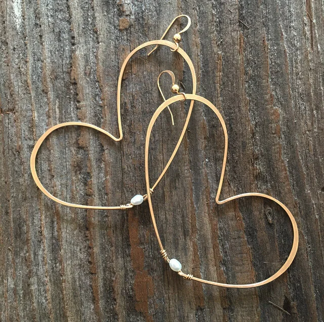 Shop › Hearts Image 1 of 1 Hearts $78.00 14k gold filled, flat hammer finish with fresh water pearls.about 3” total in length. Purchase Added! 14k gold filled, flat hammer finish with fresh water pearls.about 3” total in length.