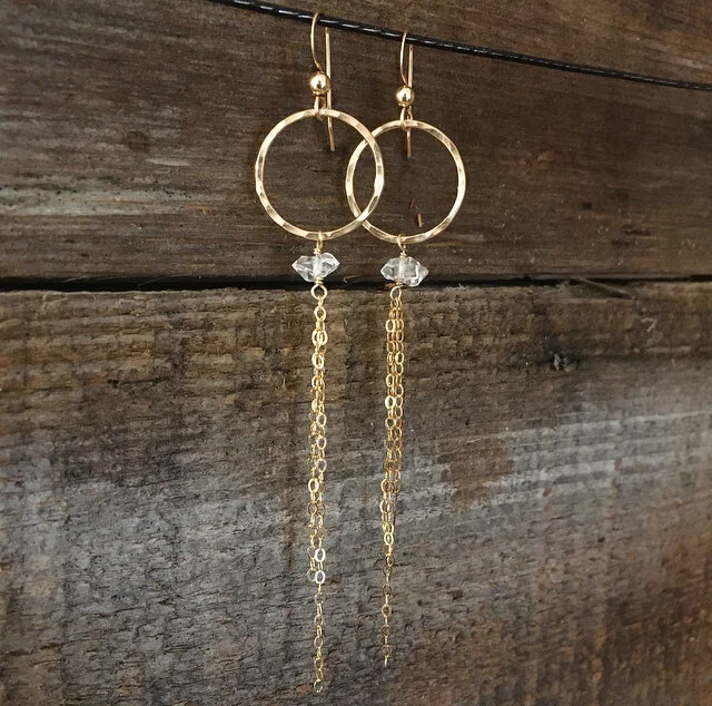 Shop › Stella Drops Image 1 of 1 Stella Drops $74.00 sold out 14k gold filled, with a herkimer diamond and a hammered finish.about 3.5” total in length. Sold Out Added! 14k gold filled, with a herkimer diamond and a hammered finish.about 3.5” total in length.