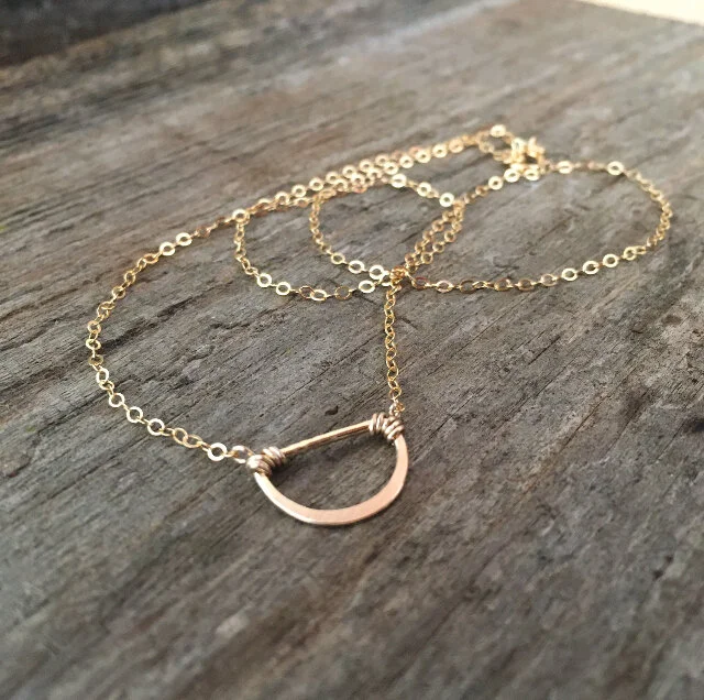 Shop › Luna necklace Image 1 of 1 Luna necklace $60.00 14k gold filled with a flat hammer finish on a 16” chain. Purchase Added! 14k gold filled with a flat hammer finish on a 16” chain.