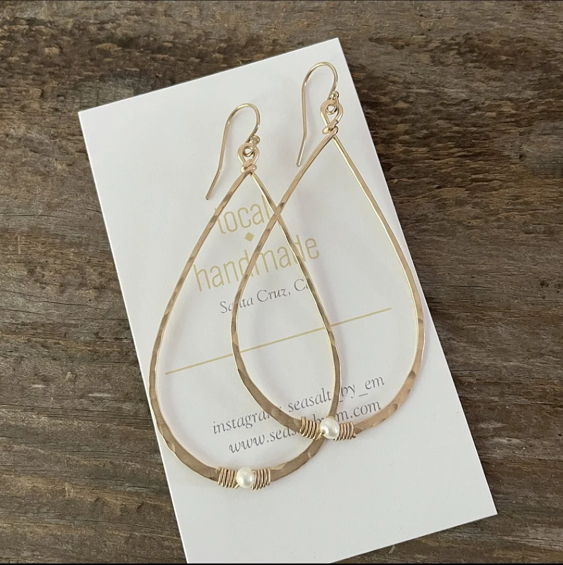Shop › Pearl Drops Image 1 of 1 Pearl Drops $76.00 14k gold filled with wrapped fresh water pearls and a hammer finish. about 2.5” total in length. Purchase Added! 14k gold filled with wrapped fresh water pearls and a hammer finish. about 2.5” total in length.