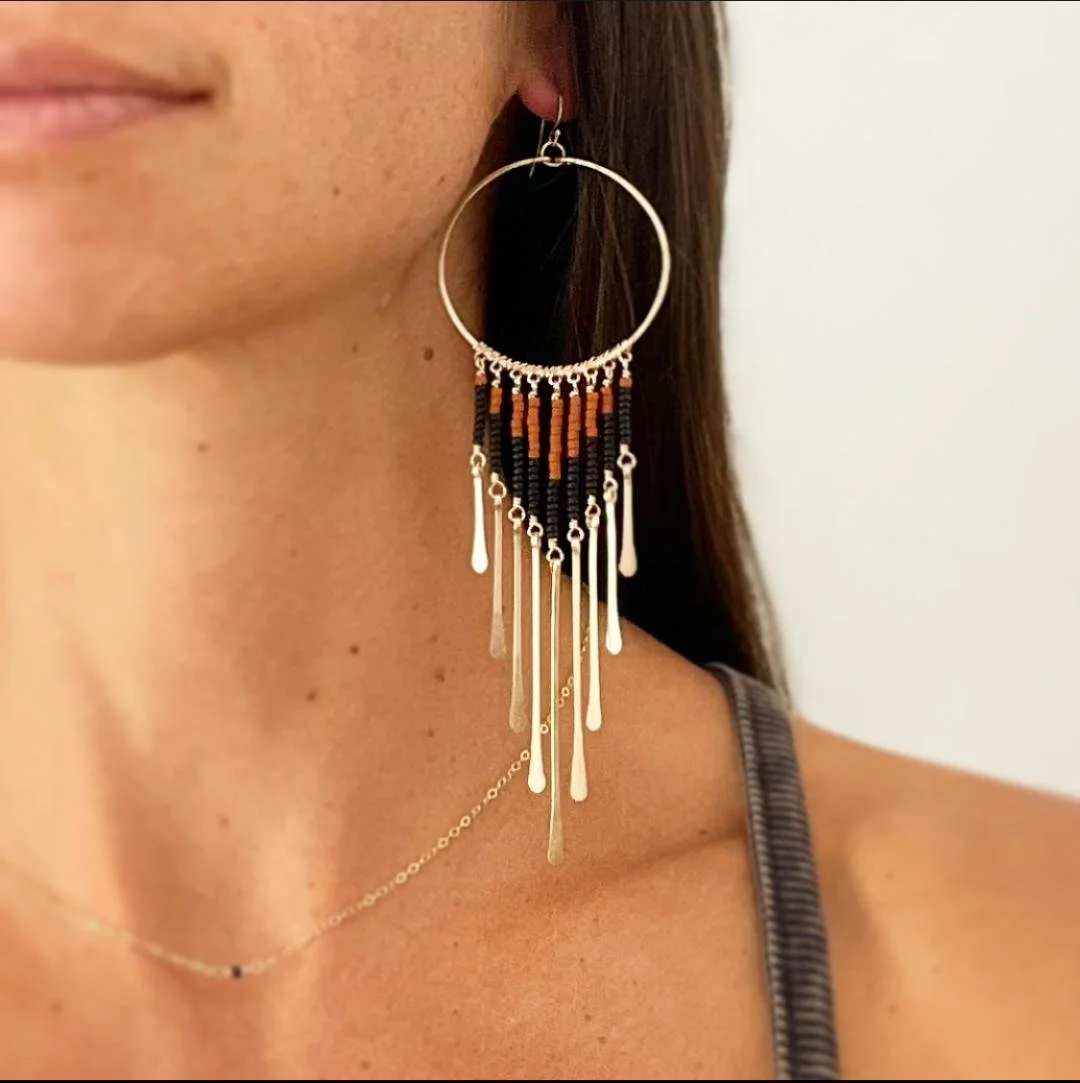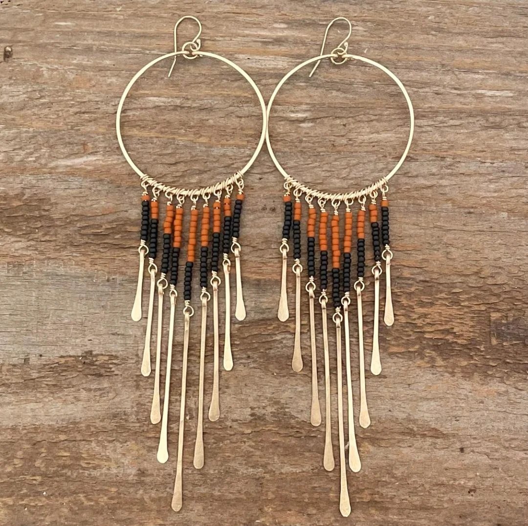 Shop › Sierra Nevada Earrings Image 1 of 2 Image 2 of 2 Sierra Nevada Earrings $223.00 14k gold filled with a flat hammer finish. Hand wrapped black and terracotta seed beads. About 5” total in length Purchase Added! 14k gold filled with a flat hammer finish. Hand wrapped black and terracotta seed beads. About 5” total in length
