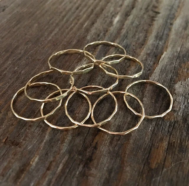 Shop › Stacking Rings Image 1 of 1 Stacking Rings $25.00 14k gold filled. hammered finish Size: 4.5 5 5.5 6 6.5 7 7.5 8 8.5 9 Purchase Added! 14k gold filled. hammered finish
