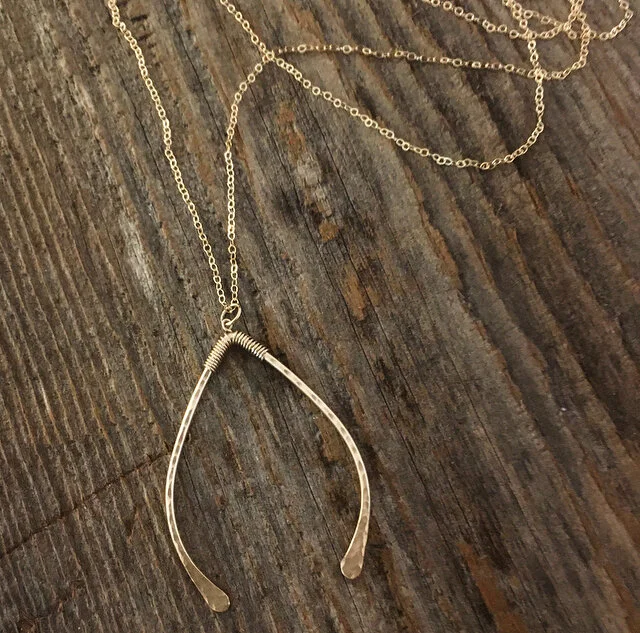 Shop › 30” Wish Bone Necklace Image 1 of 1 30” Wish Bone Necklace $82.00 14K gold fill, hammered finish. long, 30" chain Purchase Added! 14K gold fill, hammered finish. long, 30" chain