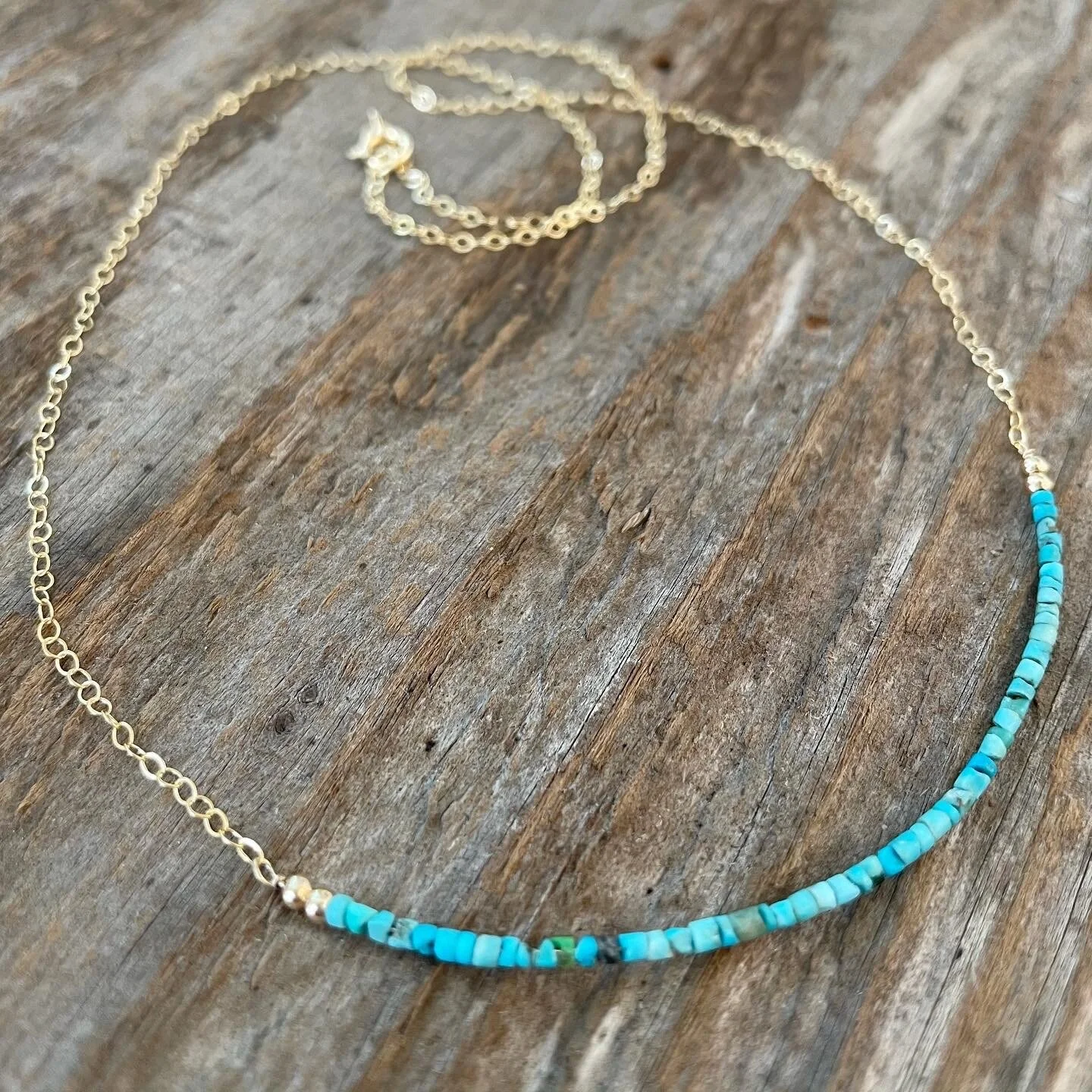 14k gold filled chain with natural turquoise tube beads and two 14k gold beads on each end.